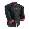 The traditional Kung Fu uniform in classic black with red trim! This uniform design is the favorite among traditional stylists, especially in southern China. Authentic mandarin collar and interloop knot closure, reinforced for durability. Poly/cotton blend. The customary half-sleeve cut leaves the forearms ready for sparring practice.